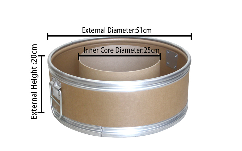 Manufactured from Kraft paper, with a metal rolling chimb fitted to the top and base of the drum for additional strength. A full cover lid allows the drums to interstack and is secured in place by a metal lever-closing ring, which has a tamper evident feature. A solid wooden base disc along with an Internal fitted centre core helps your product dispense easily and tangle free. This pack offers excellent shipping performance.
